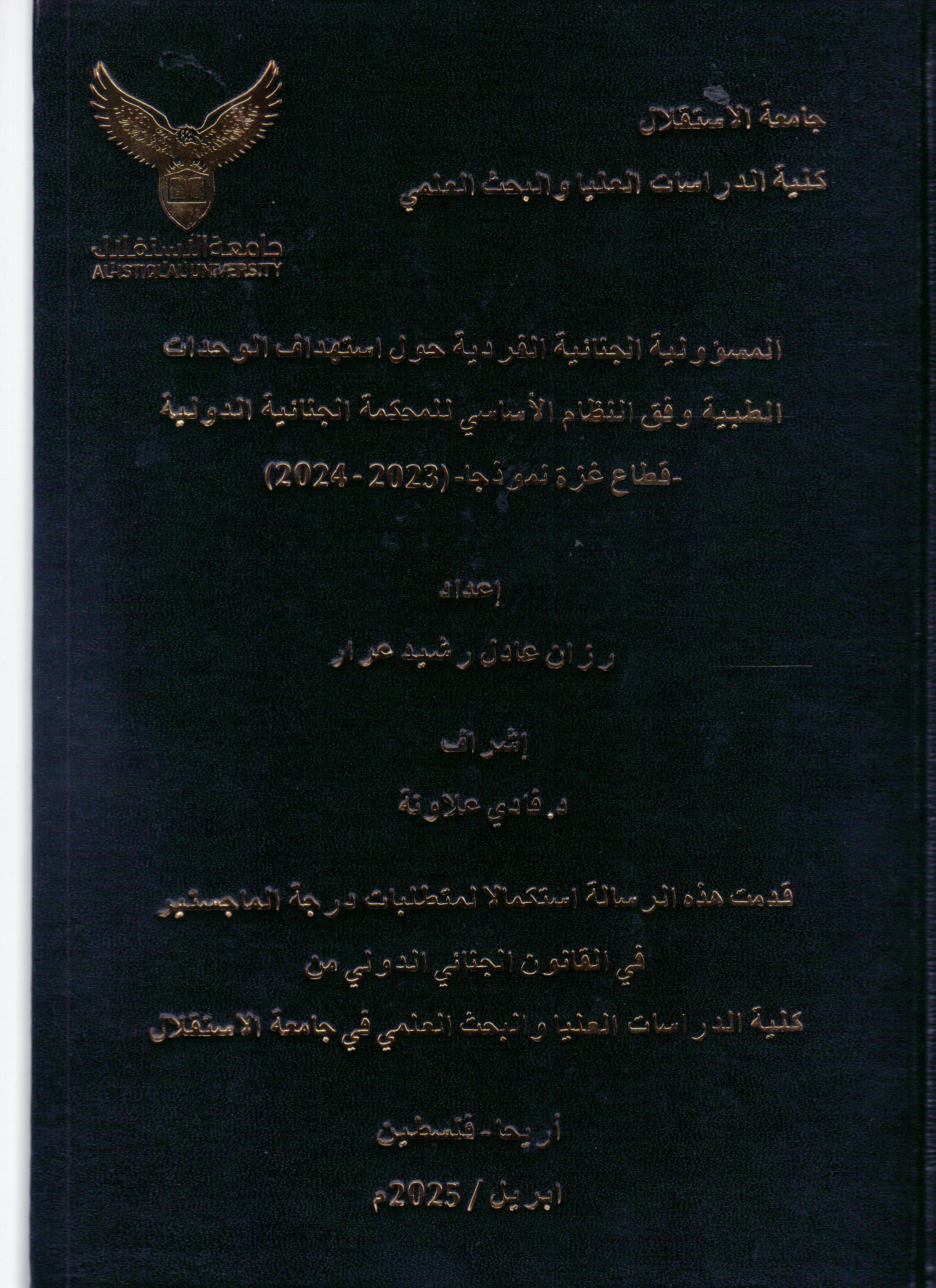 | TITLE | المسؤولية الجنائية الفردية حول استهداف الوحدات الطبية وفق النظام الاساسي للمحكمة الجنائية الدولية -قطاع غزة انموذجا- |
