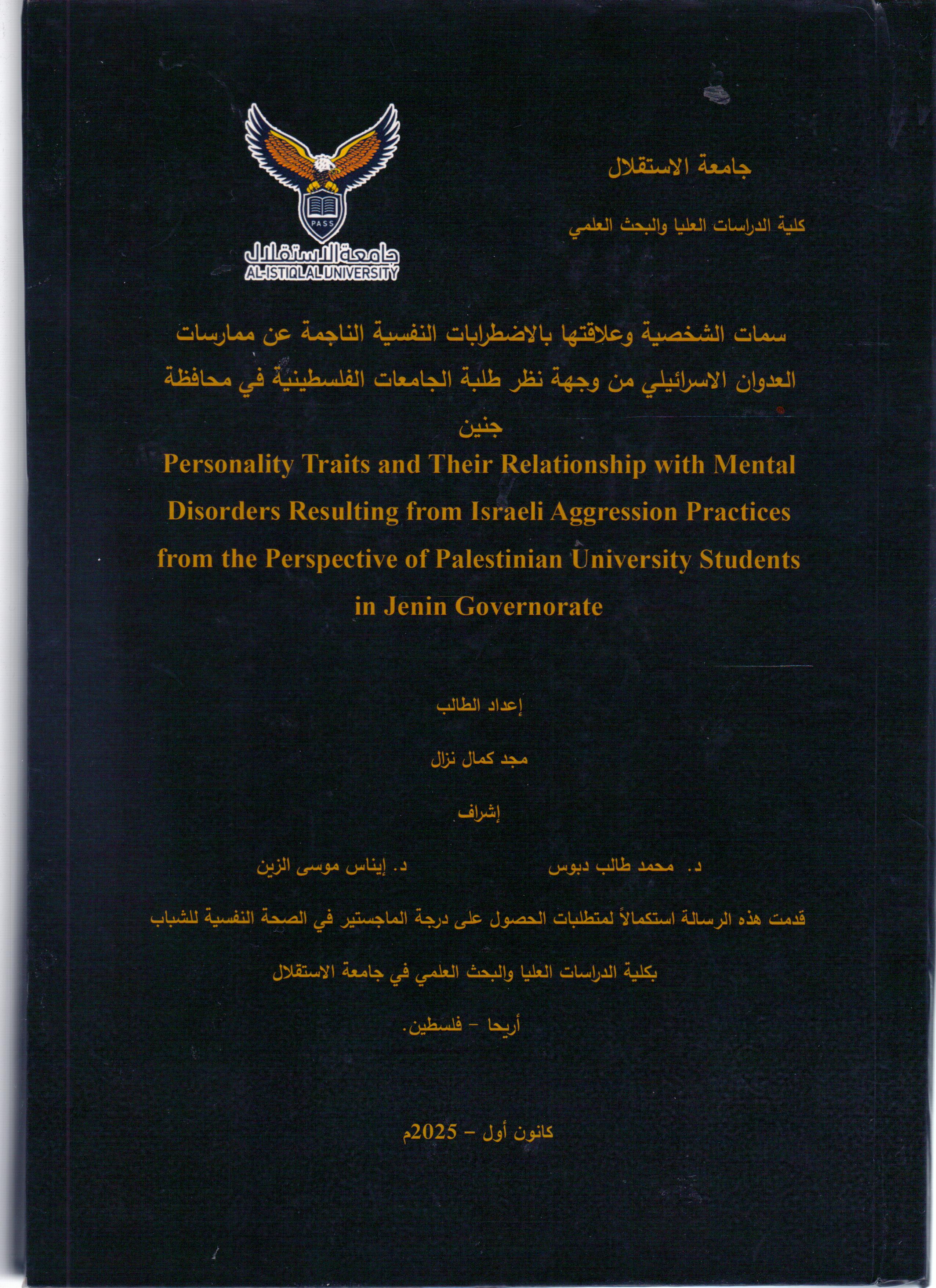 سمات الشخصية وعلاقتها بالاضطرابات النفسية الناجمة عن ممارسات العدوان الاسرائيلي من وجهة نظر طلبة الجامعات الفلسطينية في محافظة جنين ر/155.2/س م ا